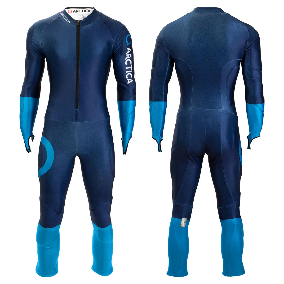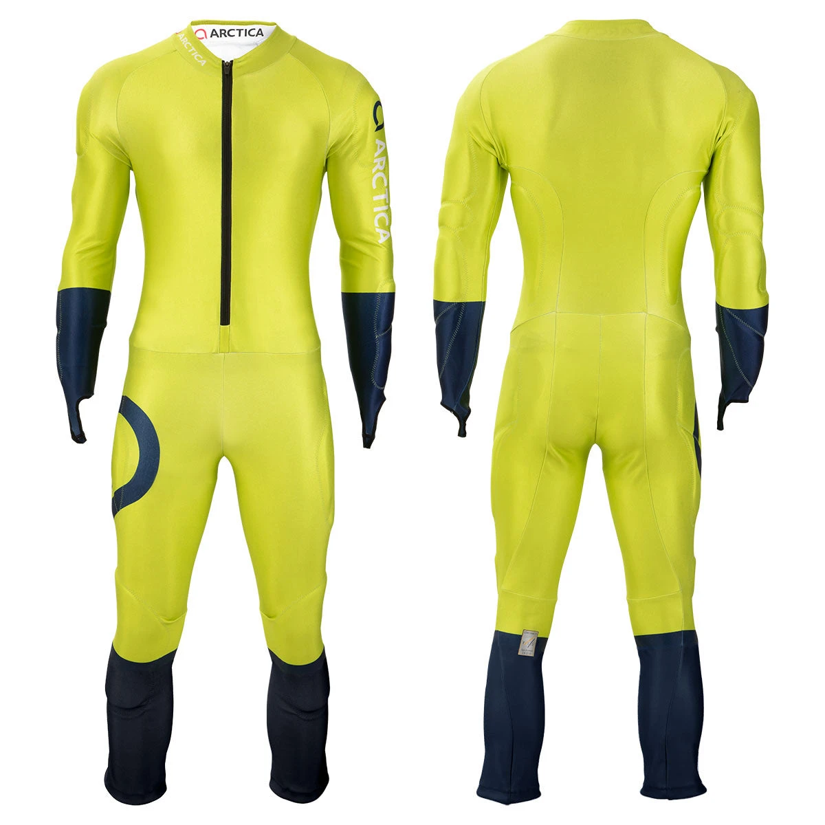 The Arctica GS Speed Suit for unmatched quality, performance, and value. The FIS logo printed on the back left leg ensures legality. Engineered with a nine-panel anatomical construction and elastic thread to provide the best possible fit. Each race suit is cut and printed individually using a special process to ensure bright colors and long-lasting graphics. Spring-loaded zipper pulls, and silicone cuff grips guarantee that your suit is in place and close to the body. Pads are removable to customize per racer preference.